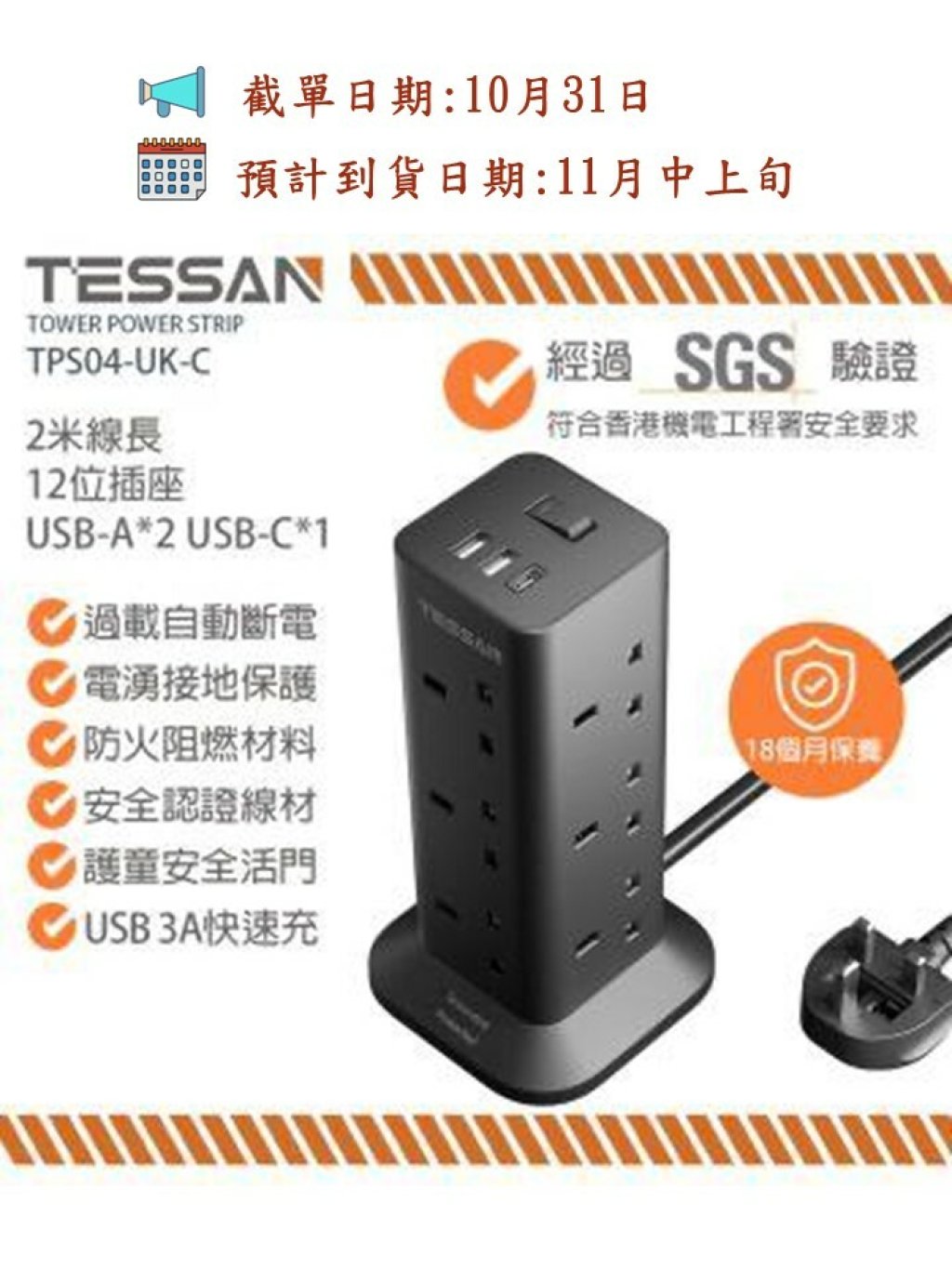 🟡TESSAN 3端口USB+8位英規塔型拖板 2米線長 TPS03-UK-C🟡
