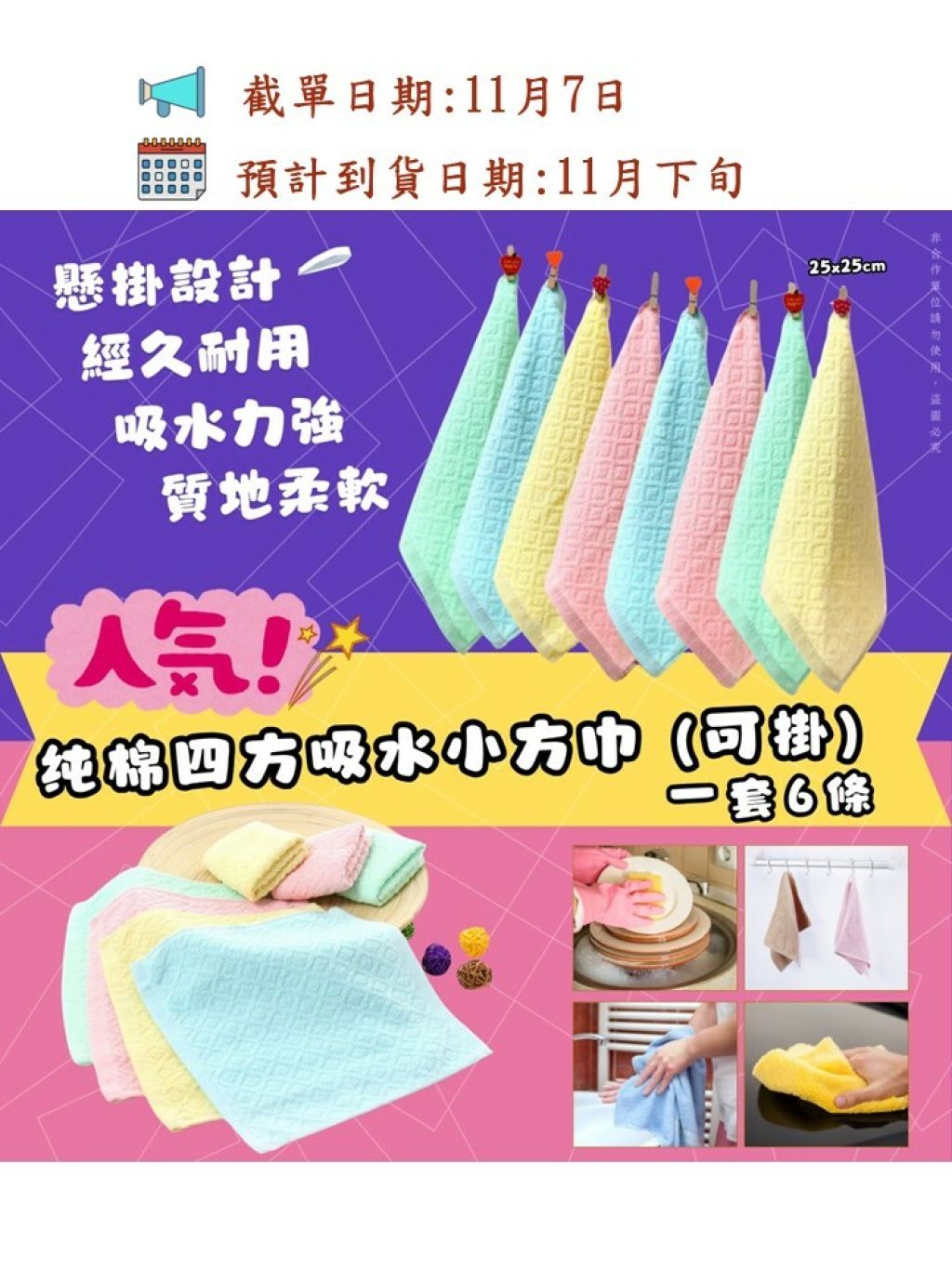 🟡純棉四方吸水小方巾 (一套6條) 隨機顏色🟡