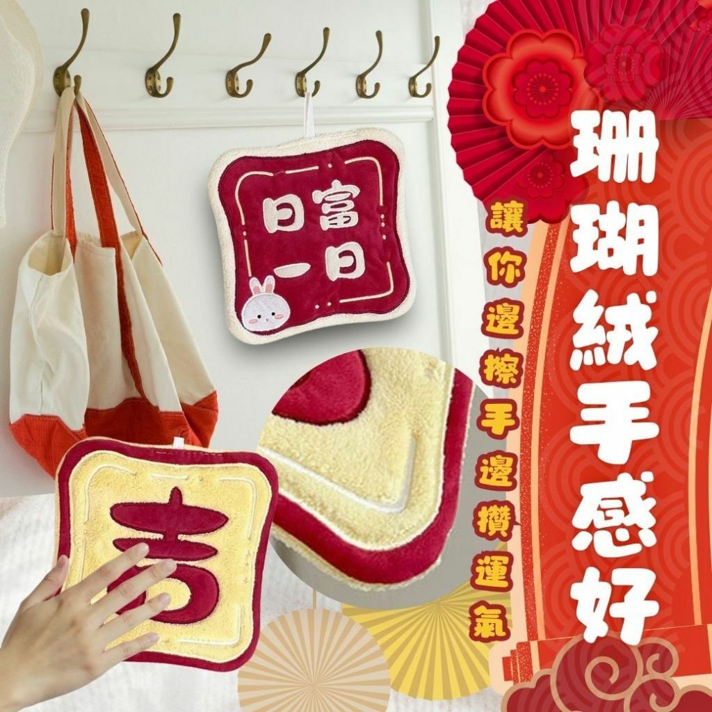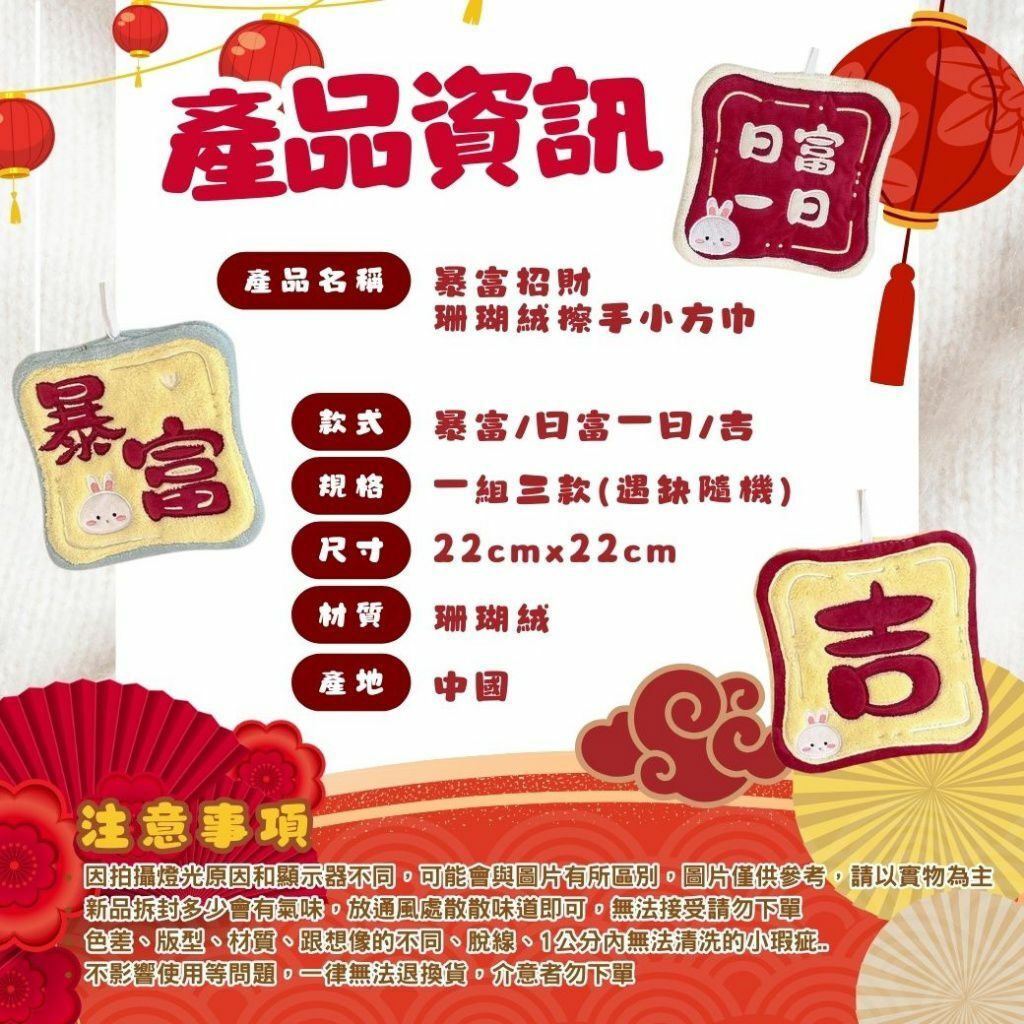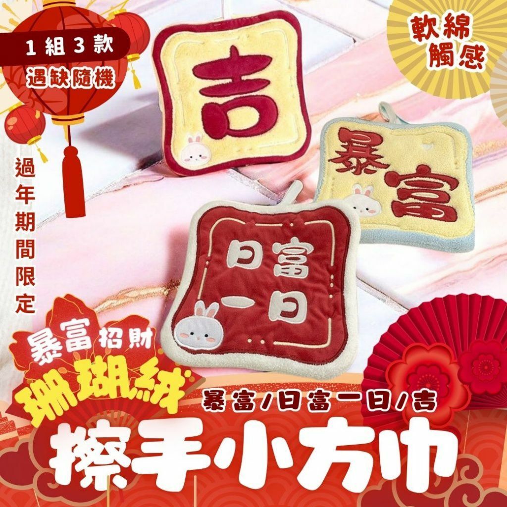 過年期間限定🧧暴富招財珊瑚絨擦手小方巾(1組3款 )