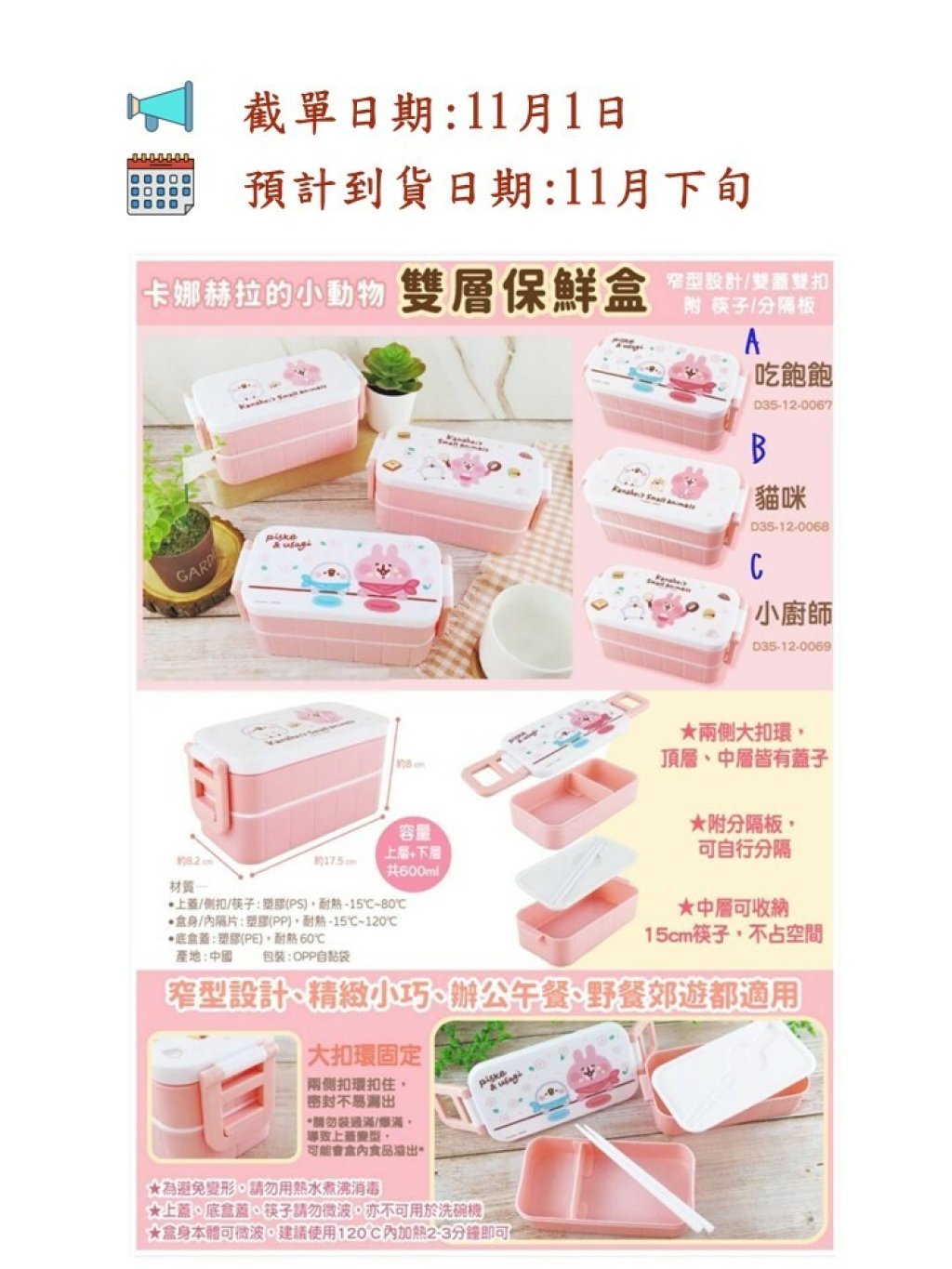 材質:盒身,內格片/PP,耐熱120゜c,上蓋,廁扣,筷子/PS,耐熱80゜c,底盒蓋/PE,耐熱60゜c