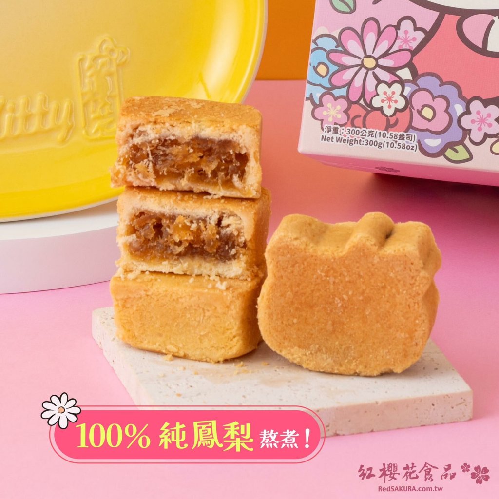 誰說鳳梨酥一定是方方正正的?紅櫻花獲得三麗鷗授權Hello Kitty,推出超可愛Kitty造型的鳳梨酥,讓你不只吃得美味,看得更開心。台灣最經典的鳳梨酥禮盒,特殊的濃郁果香,果實小、甜度高、酸度低,原始的酸甜果香和纖維,就算成本再高紅櫻花也要使用這麼好的食材,堅持採用純正100%鳳梨熬煮調製而成的鳳梨酥內餡,不添加防腐劑,誠意滿滿的餡料,讓你可以直接品嚐到鳳梨纖維的濃郁果香,健康低糖,加上極佳的Q軟口感,微酸微甜,配上嚴選紐西蘭奶油細心桿製而成的餅皮,外酥內軟,美味讓人忍不住一口接一口。