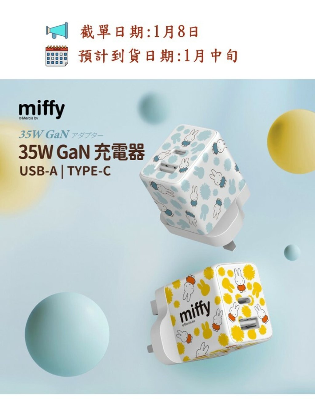 🟡miffy🐰 2 Port 35W PD 3.0 & QC 3.0 GaN 充電器🟡