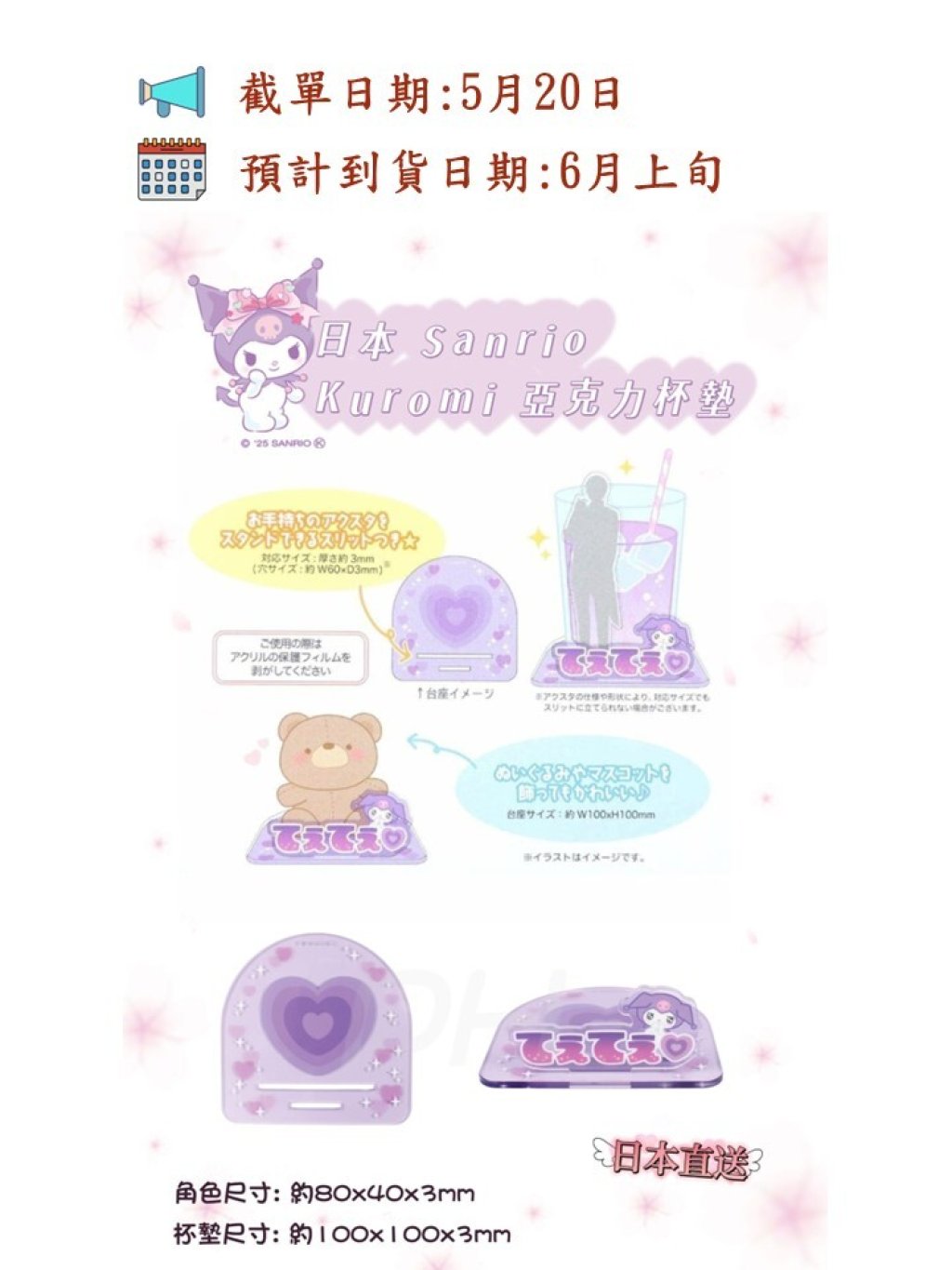🌈採用光滑細膩亞克力來印刷Kuromi圖案,使杯墊更加可愛有趣😍