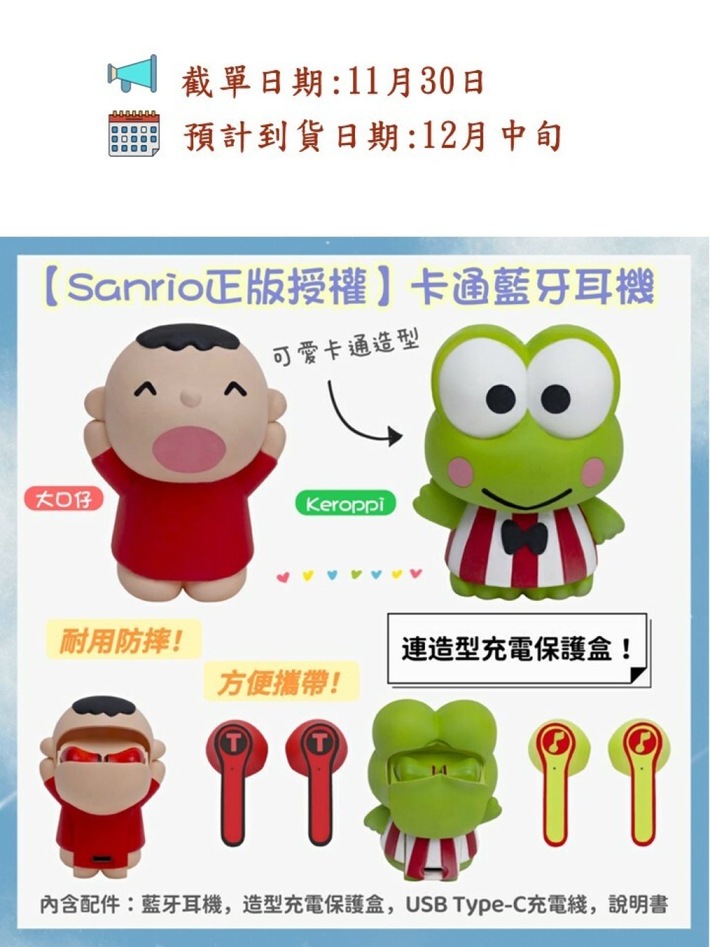 💟內含配件:藍牙耳機,造型充電保護盒,USB Type-C充電綫,說明書