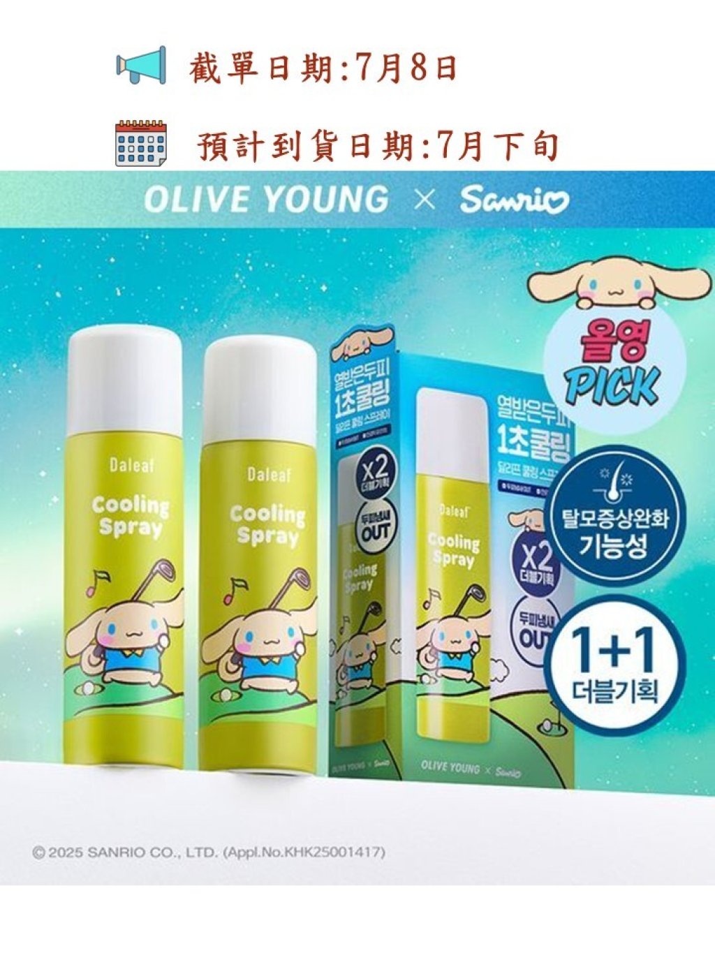 🟡Olive Young x Sanrio 肉桂捲 Dalip 小球藻莓果頭皮降溫噴霧2支裝 (100ml)🟡
