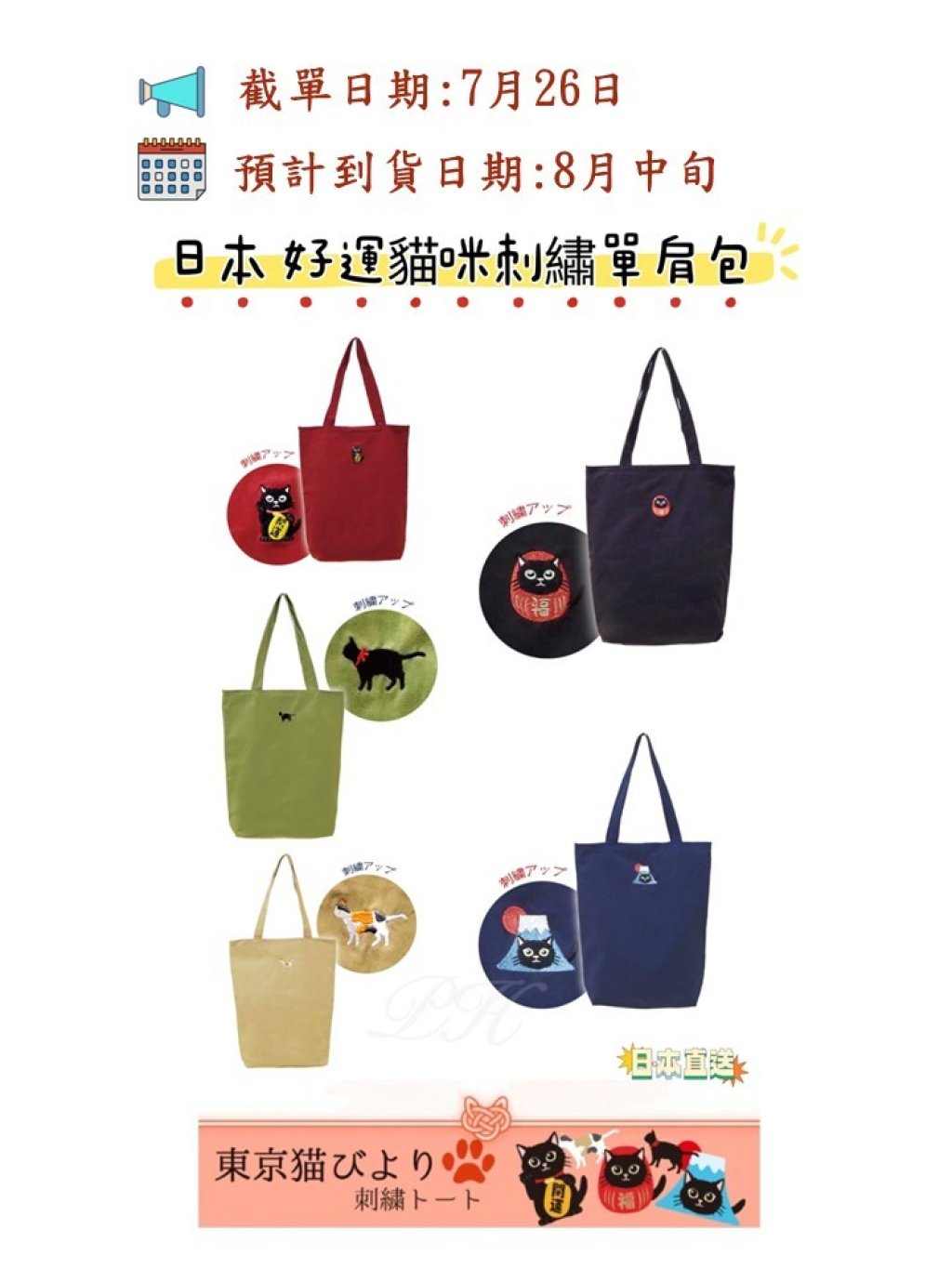 自古以來,日本就使用黑貓和印花布貓來寓意好運🎊採用厚實的純棉布料,前面有可愛的貓咪刺繡圖案😻大容量拉鏈主袋可存放A4筆記簿📘充電寶、化妝包等日常用品🕶️無論是上班、上學、媽媽包或日常購物都非常時尚好看‼️