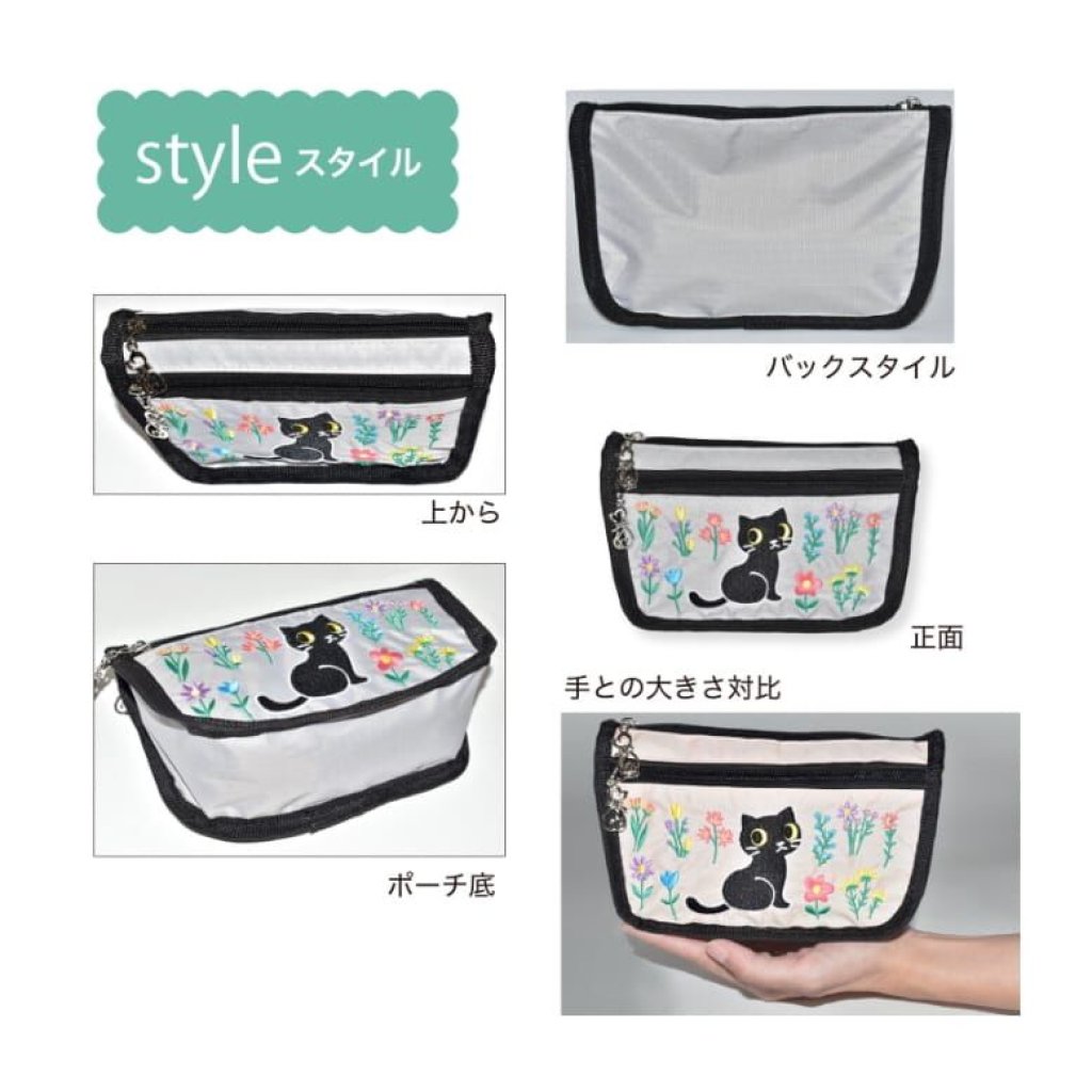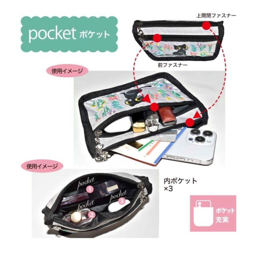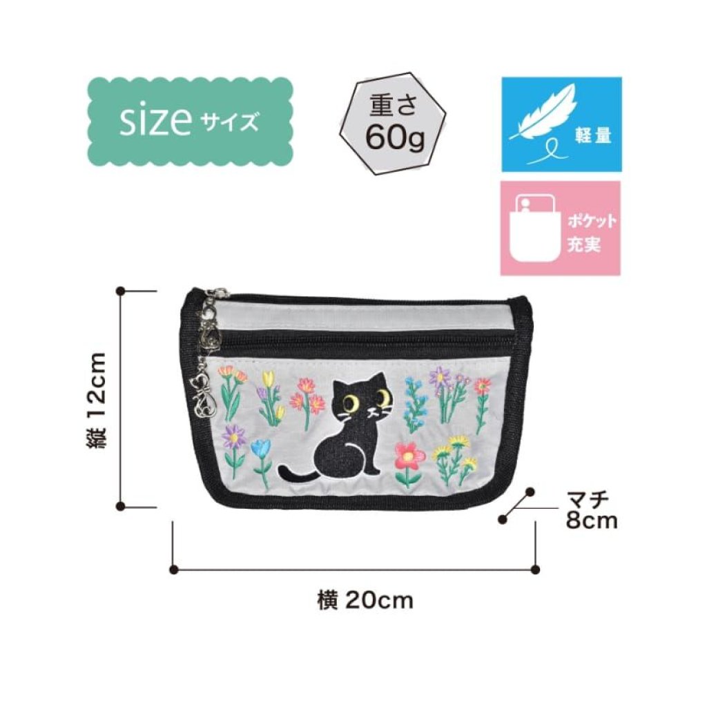 精緻可愛的貓咪刺繡圖案,2個貓型拉鏈頭作點綴🐈非常適合愛貓人士🥰3個內袋可整齊分類化妝品和配飾🫶