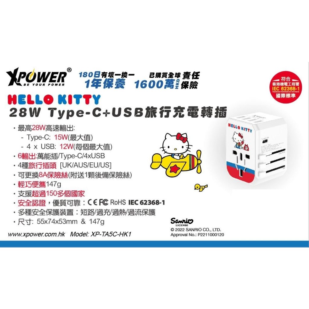 🟡XPower x Sanrio Hello Kitty 28W Type-C+USB旅行充電轉插🟡