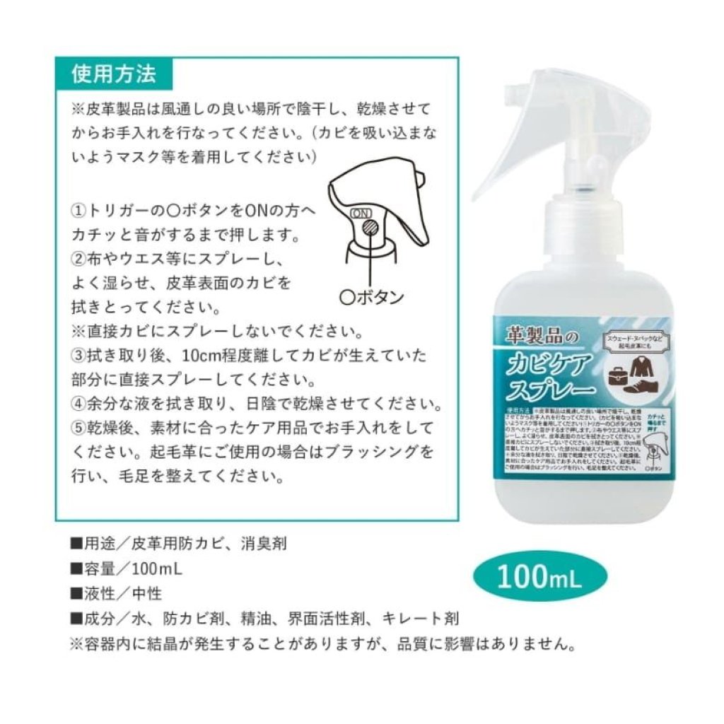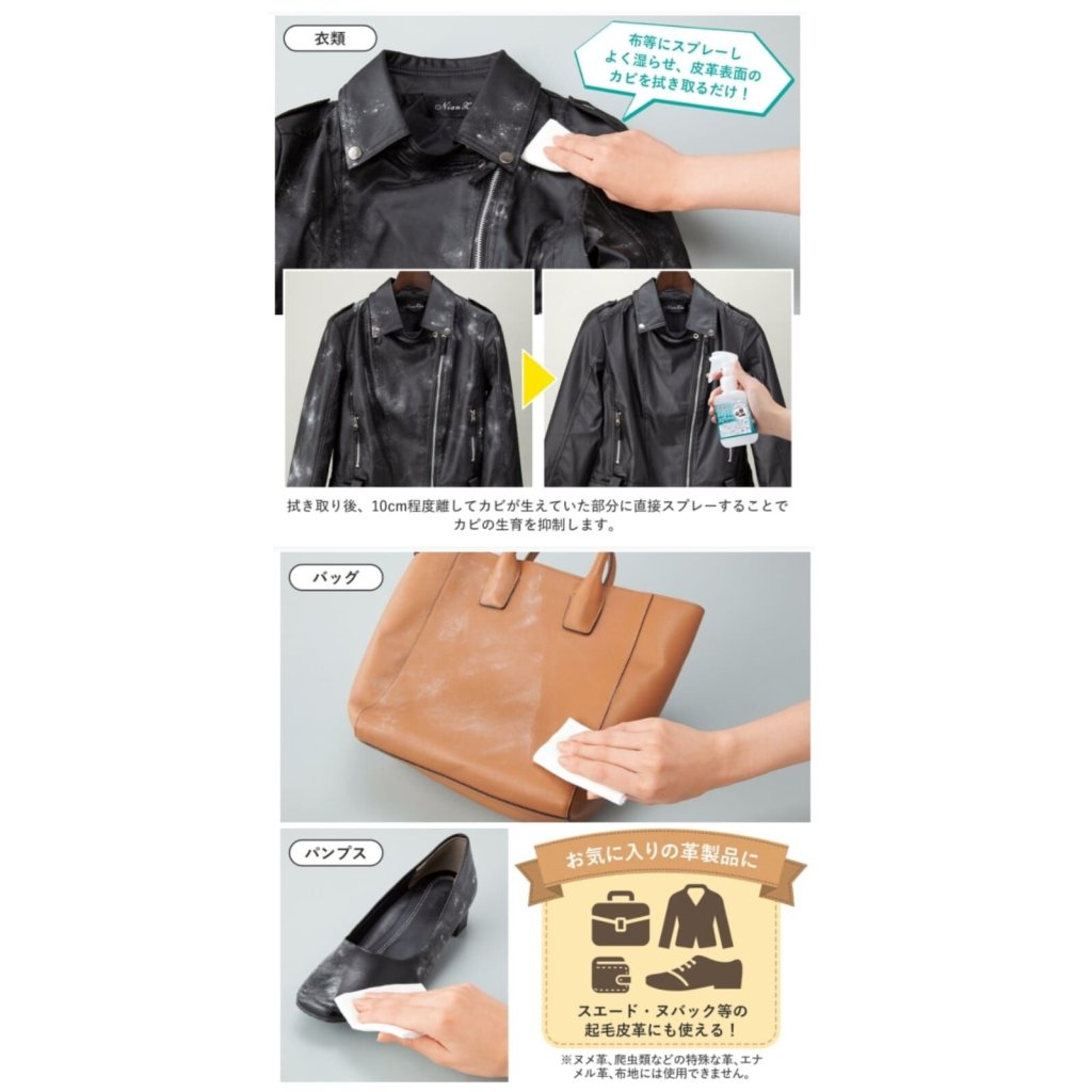 - 只需噴灑在抹布上,將其徹底潤濕,然後擦去皮革表面的霉菌(請勿直接噴灑在霉菌上)。