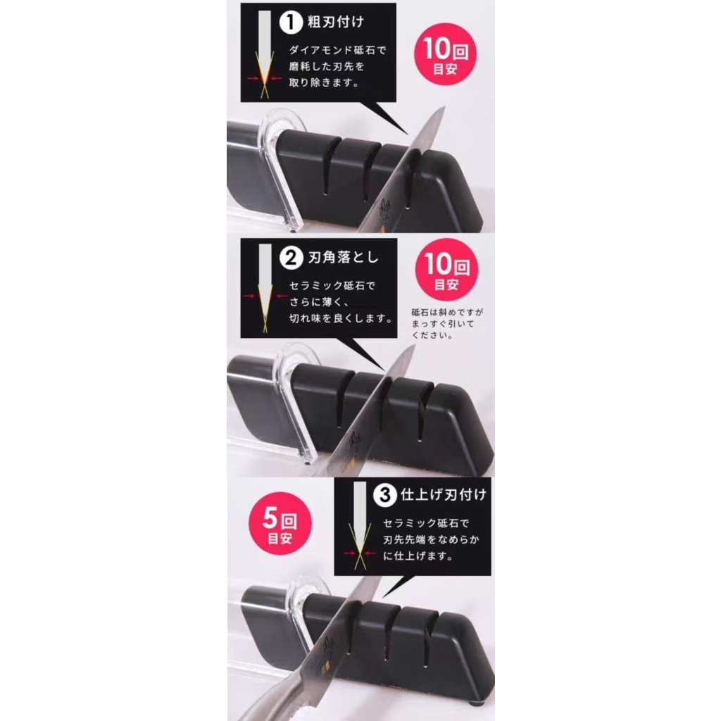 一個輪子上附著三種不同性質的磨刀石🔪按順序123使用,就能輕鬆把刀具恢復鋒利👍操作非常簡單方便!