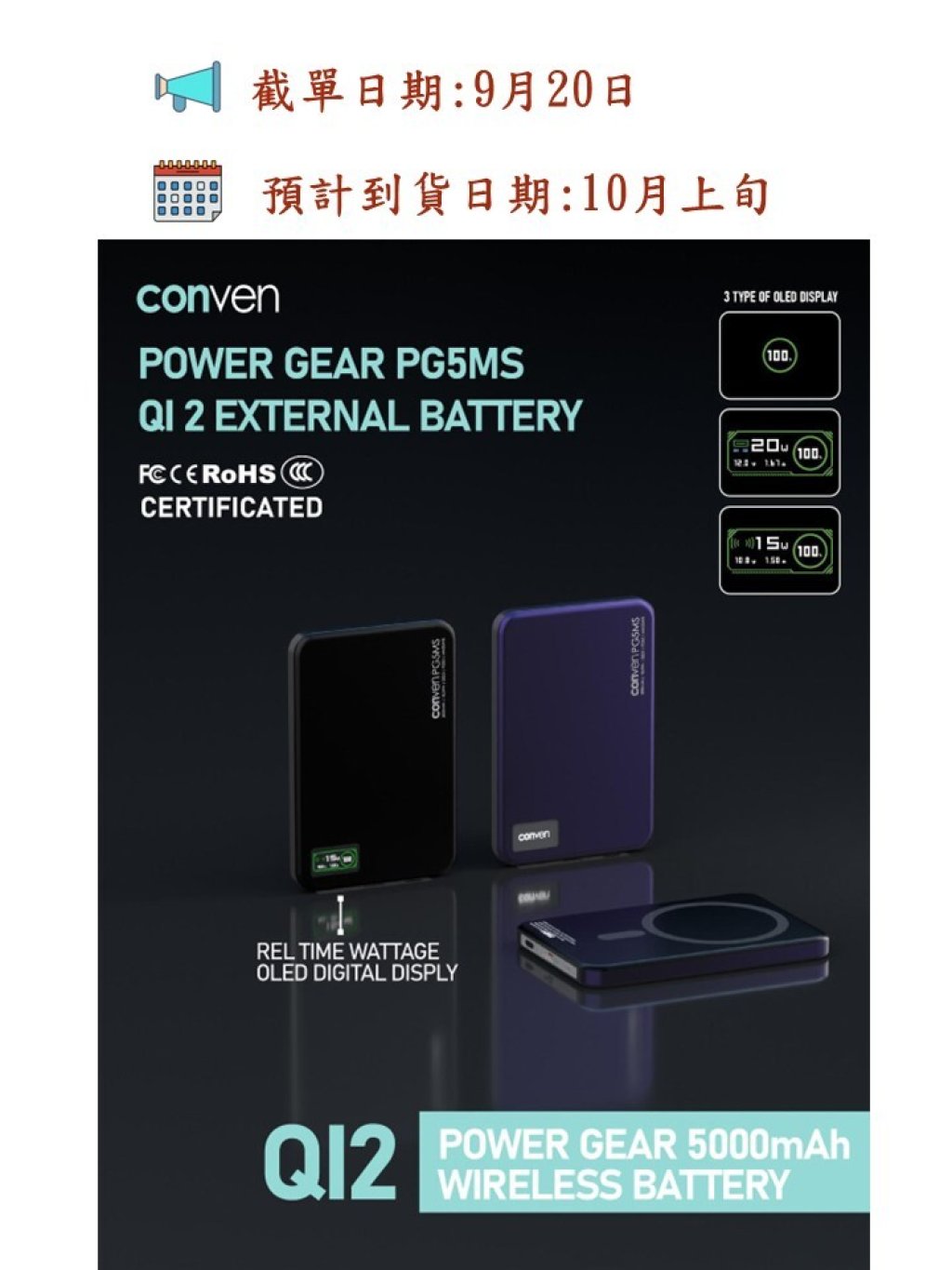 🟡CONVEN 🇭🇰 磁吸OLED外置電池 5000/10000 mAh🟡
