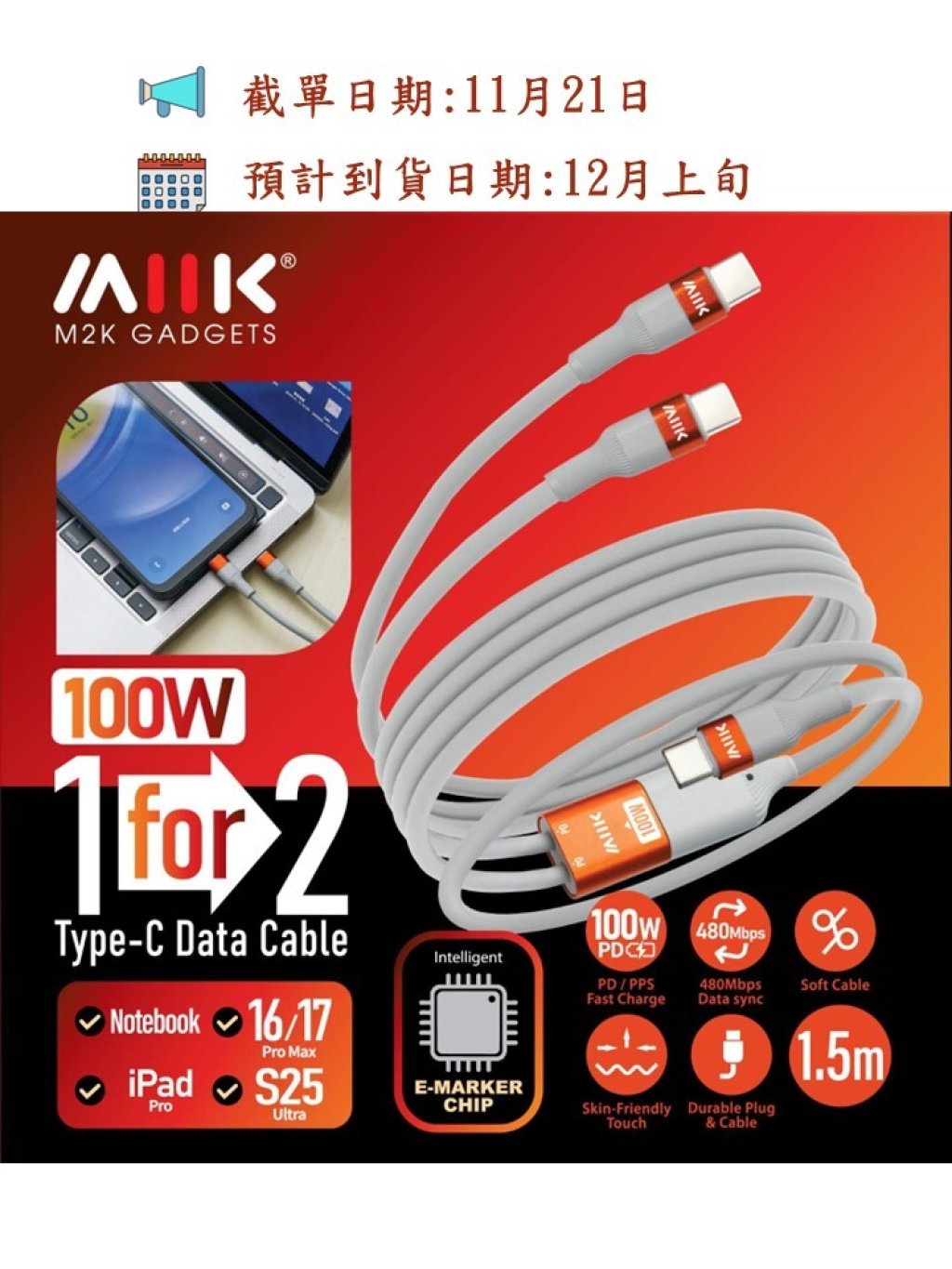 🟡M2K 100W 1 for 2 Type-C 雙頭快充傳輸線🟡