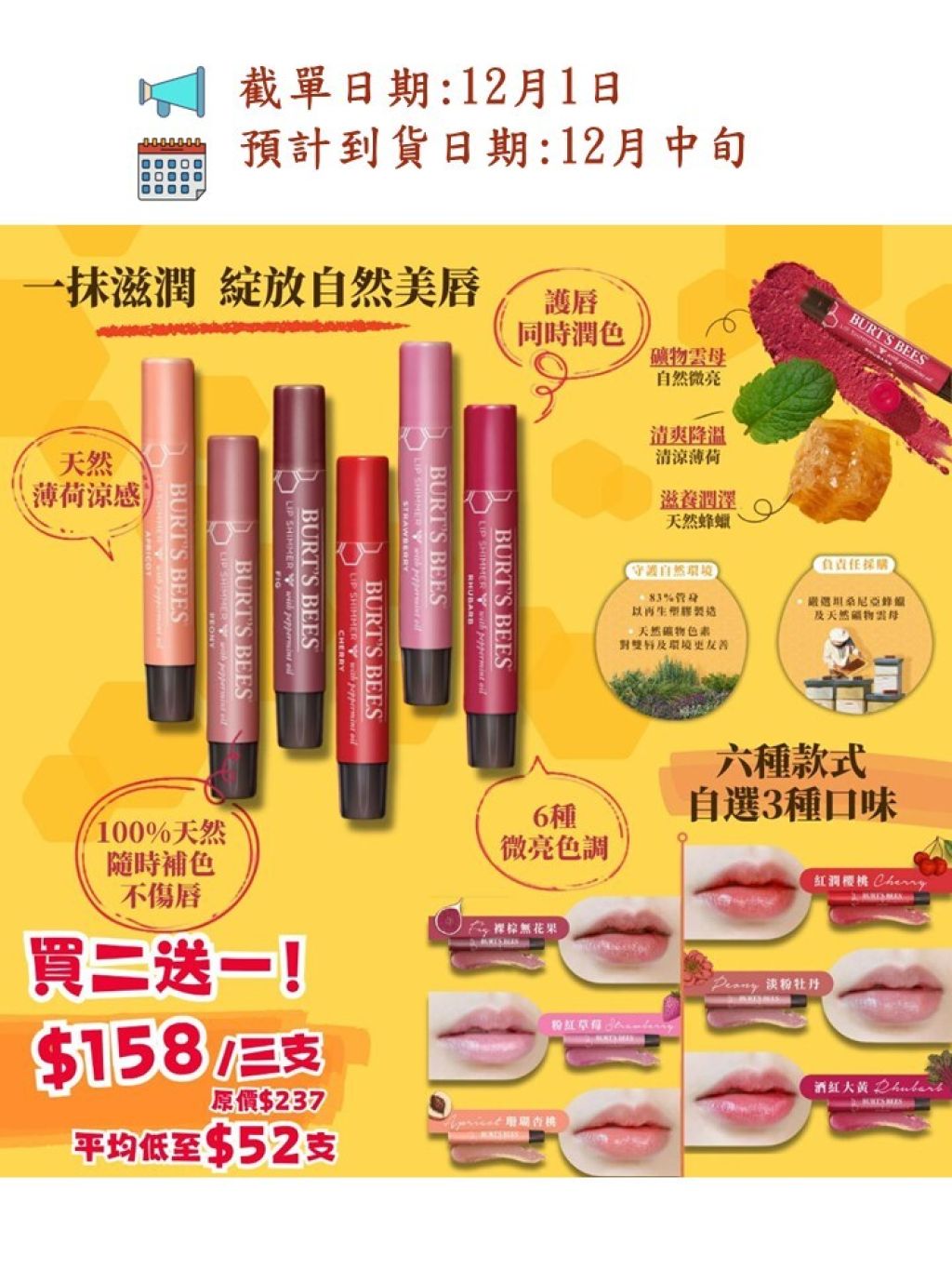 今個冬天話黎就黎🌬🌬,瞬間寒氣殺到🥶🥶!小編都係皮膚乾底嘅人,一凍塊臉就係咁甩皮,重災區⚠⚠係嘴唇乾到爆!一擦唇膏擦到啲色一舊舊,超唔好睇🫦🫦。呢期團購推出左✨✨經典天然護理品牌Burt's Bees🐝🐝嘅煥彩薄荷潤唇膏系列,護唇同時調色💄💄,令姐妹們呢個冬天都保持靚靚🌸🌸。寒冬價$158三支💄💄💄!原價$79支,而家做緊買二送一💥💥而家講緊平均$52.6支!!