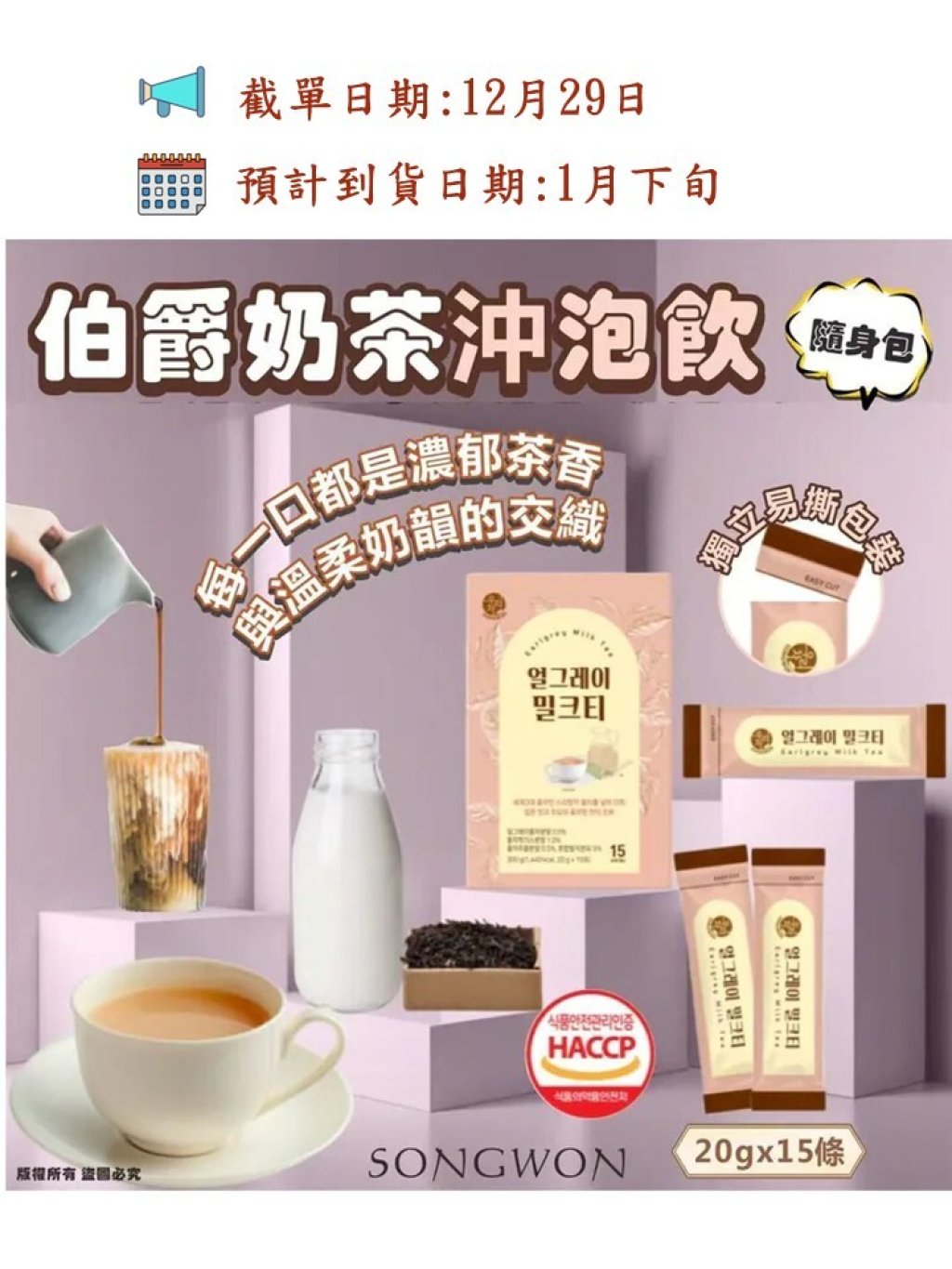 韓國SONGWON 伯爵奶茶沖泡飲隨身包, 20g*15條