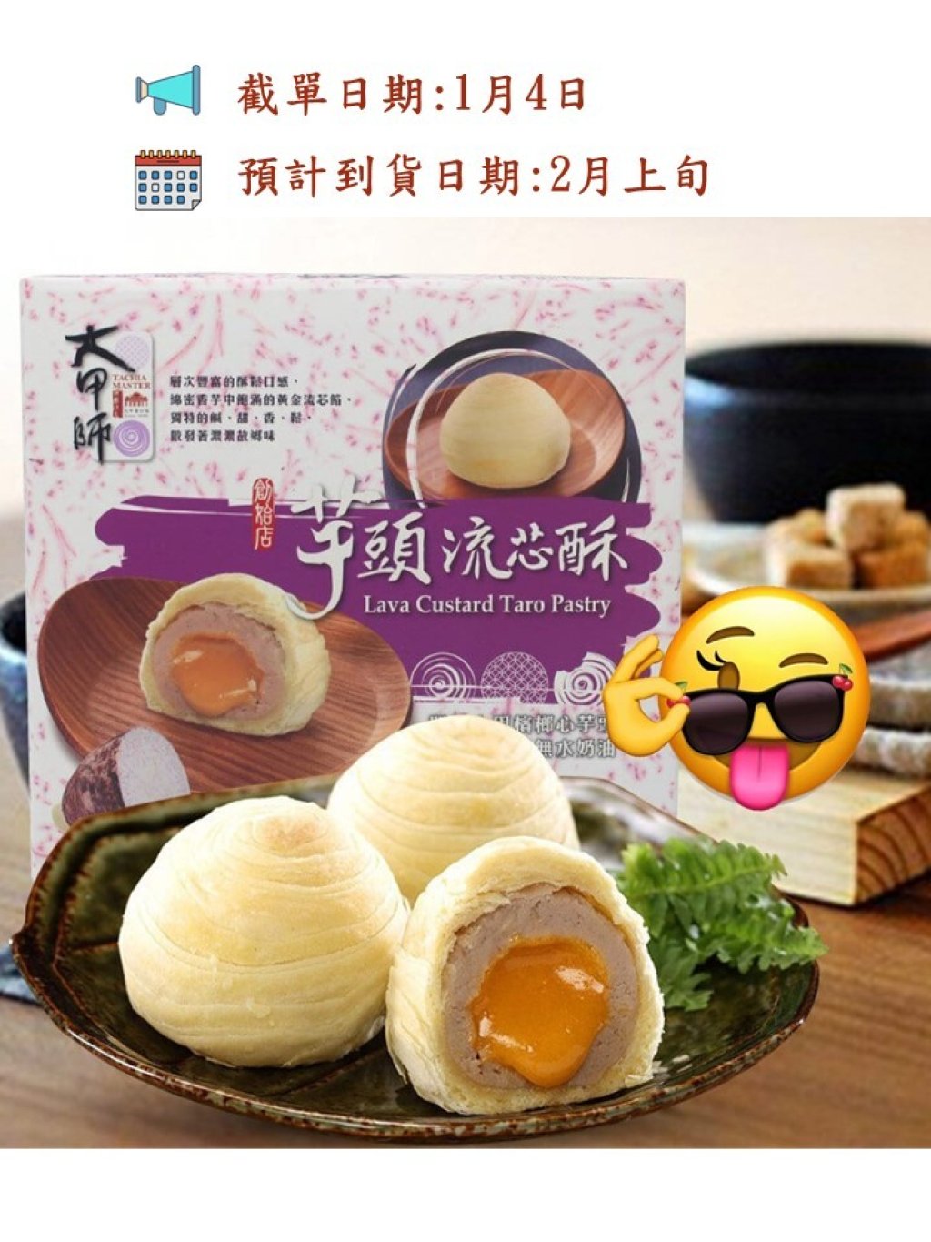 成份: 無水奶油, 小麥麵粉, 芋頭餡, 奶黃流芯餡,砂糖
