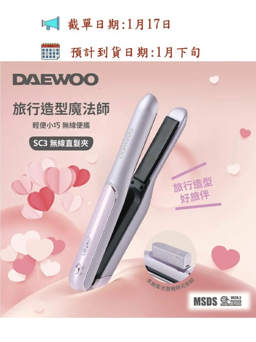 DAEWOO 最新推出SC3 無線直髮夾,可拆電設計 , 電池備有MSDS 及UN38.3 報告,