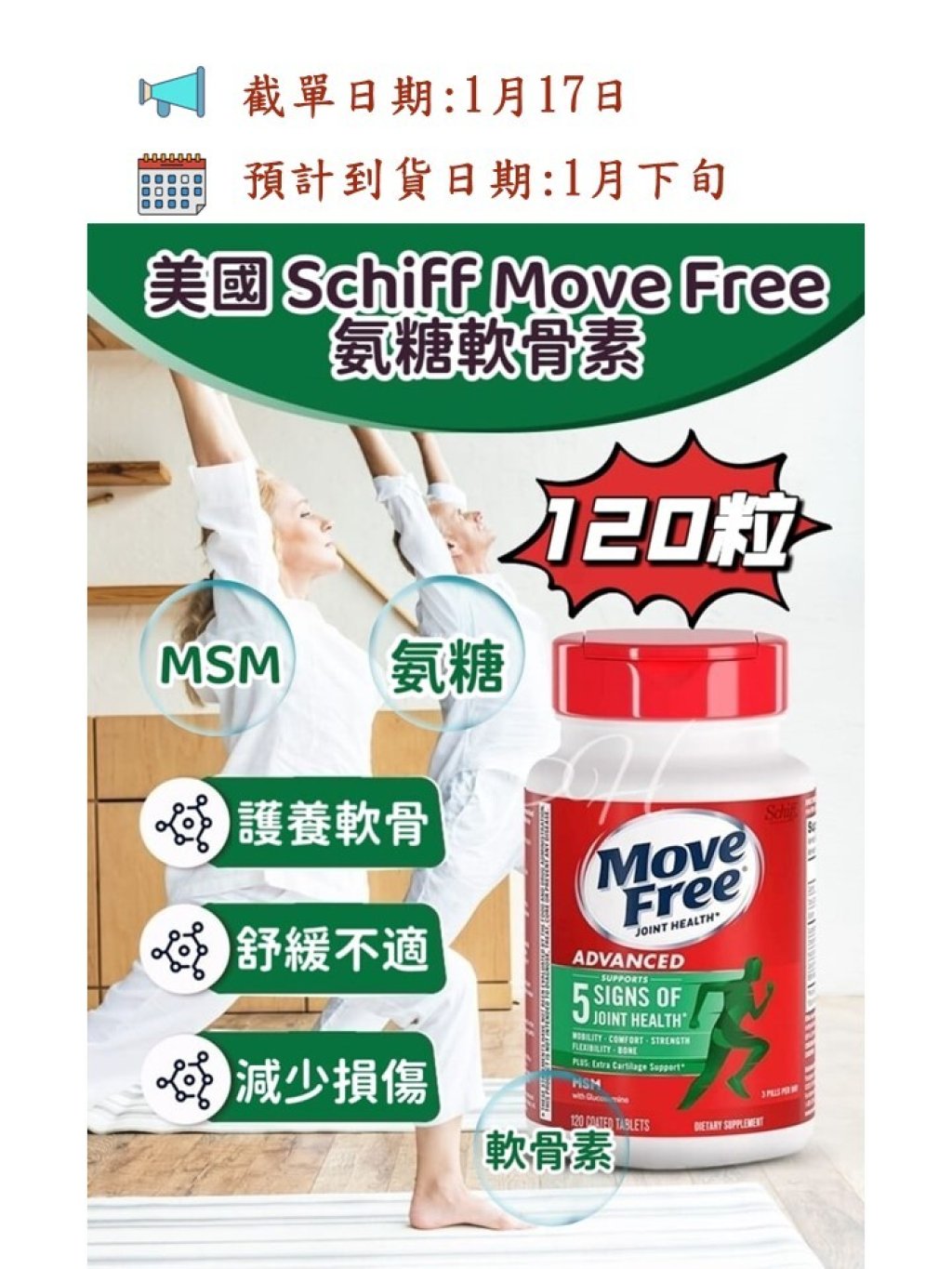🟡美國 Schiff Move Free 氨糖軟骨素+MSM緩痛加強款(綠瓶) 120粒🟡