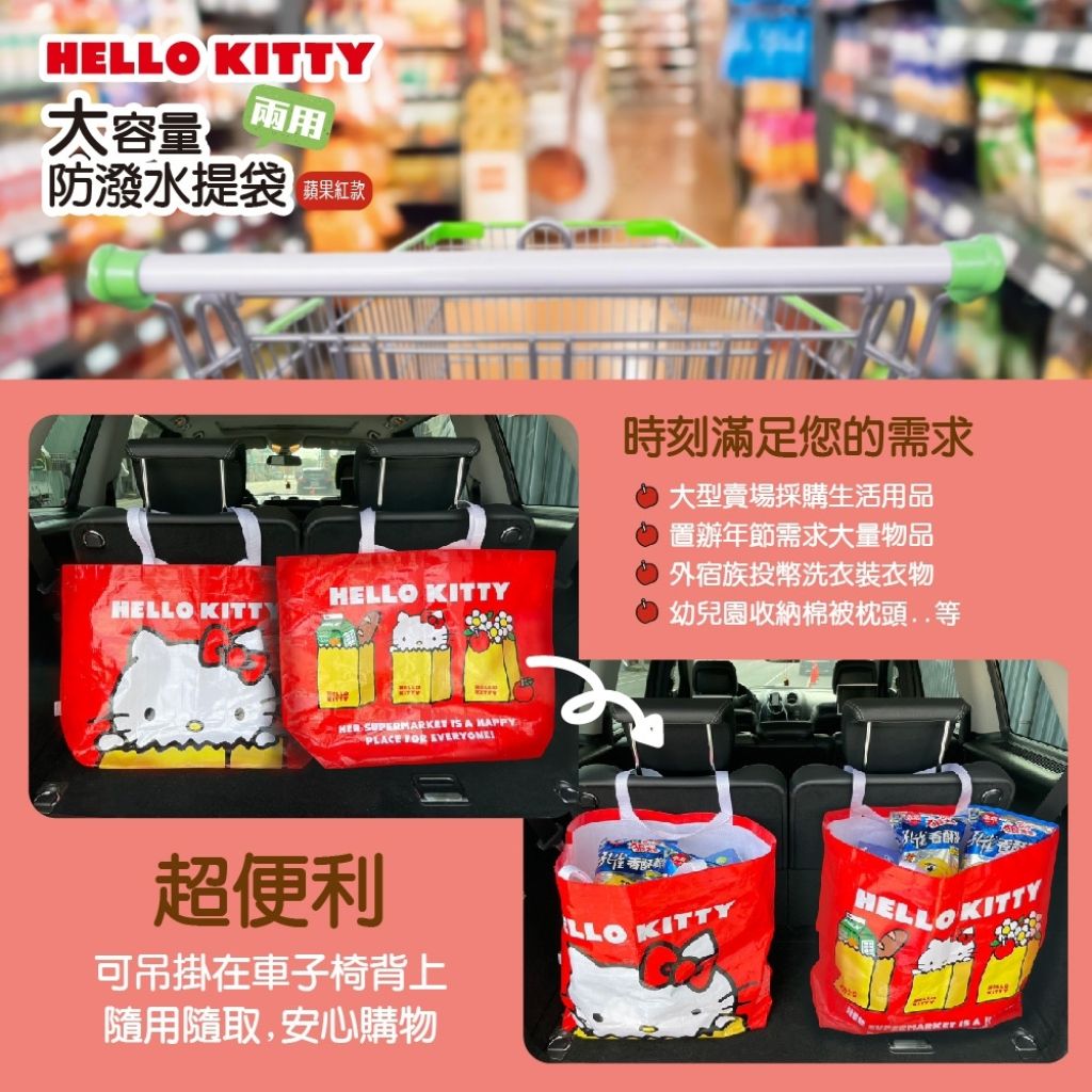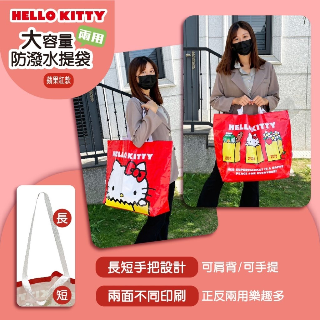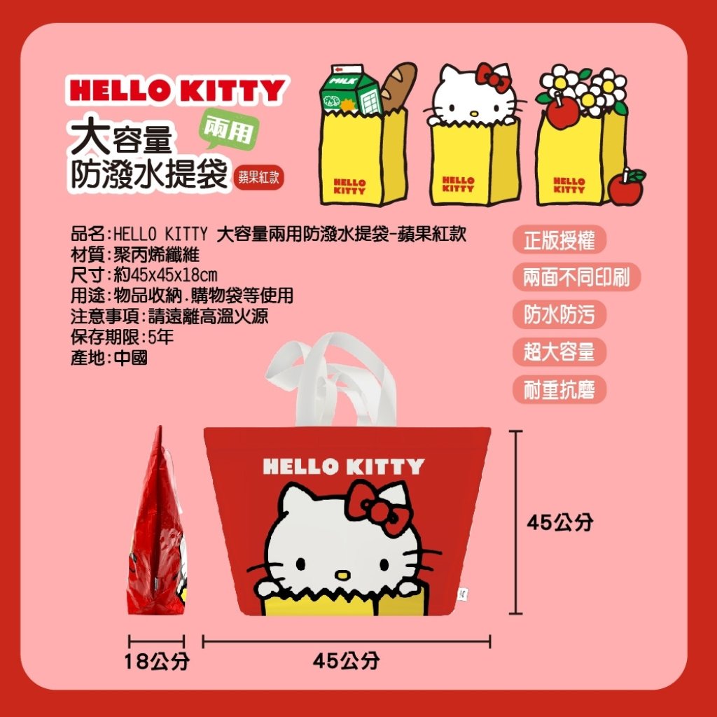 🟡台灣 Sanrio Hello Kitty 蘋果紅款大容量兩用防潑水購物袋 (1組2個)🟡