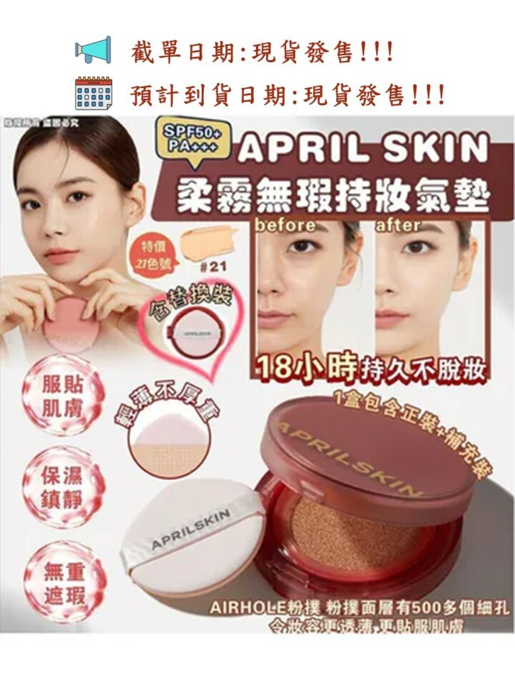 🌸最新版APRIL SKIN 柔霧無瑕持妝氣墊 SPF50+/PA+++ (正裝+補充裝)#21色