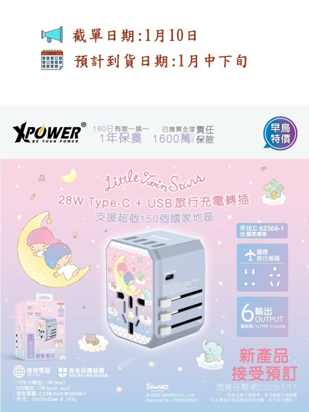 🟡XPower x Sanrio Little Twinstars 28W Type-C+USB旅行充電轉插🟡