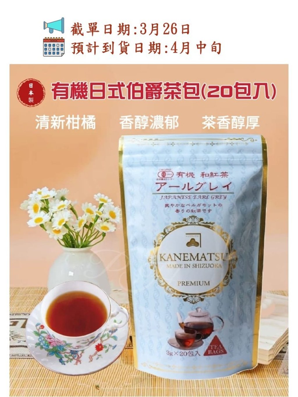 採用日本國產有機茶葉🌱加入佛手柑製成的伯爵茶,帶有濃郁茶香與清新的柑橘香氣☕可幫助消化、振奮提神,享受愉悅的時光!