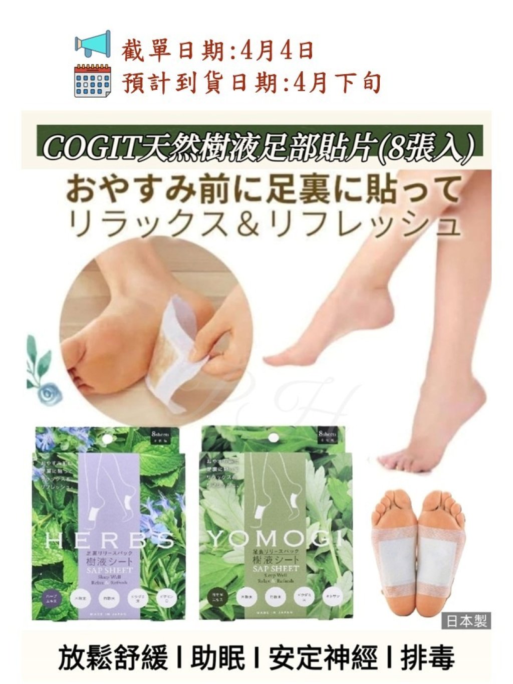 含多種天然成分的樹液製造🌿睡前貼於腳底,幫助放鬆舒緩、助眠、安定神經‼️ 把身體日積月累嘅毒素吸出並排出體外👍温和地照顧您疲累嘅雙腳🦶🦶