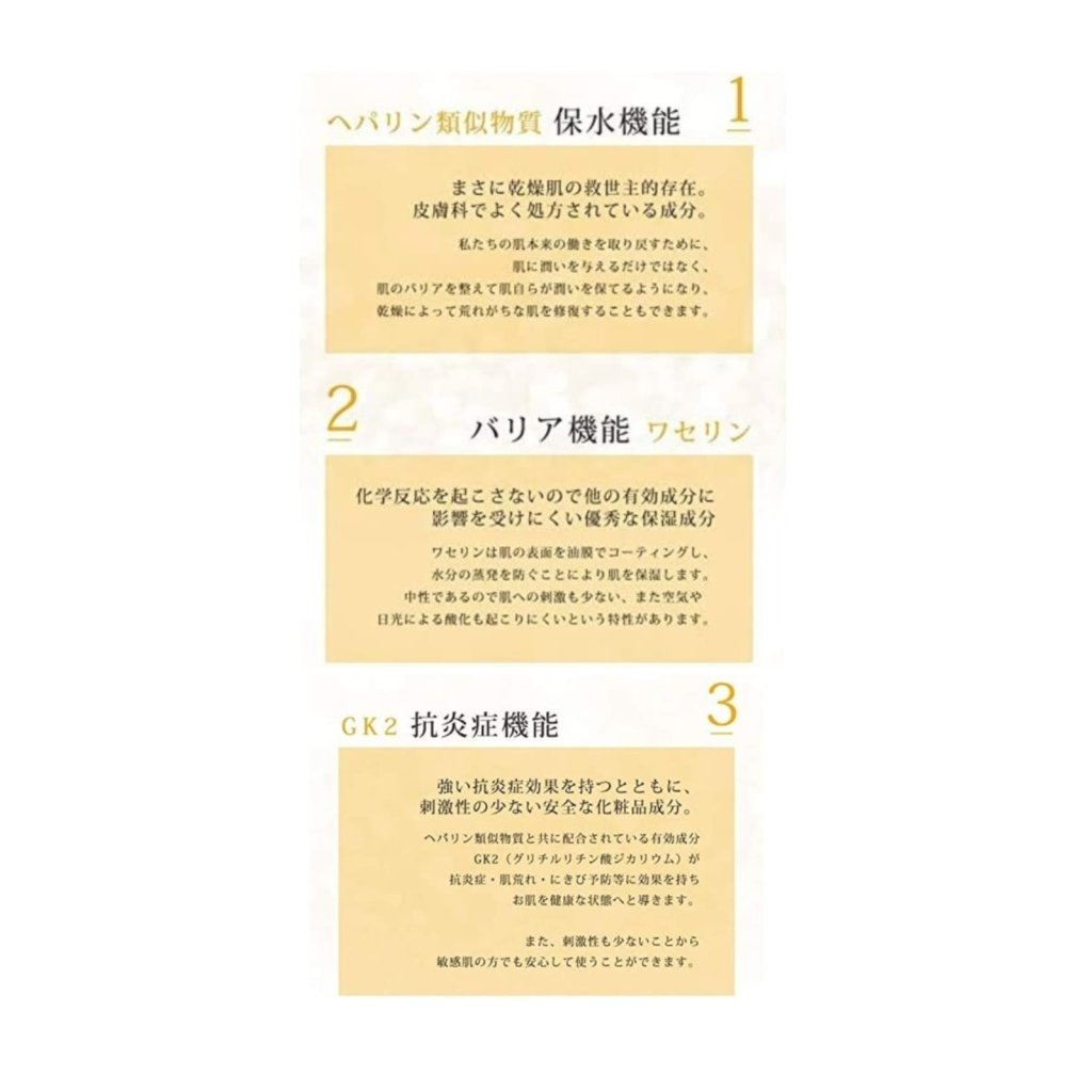 本產品有4種功能(保水/屏障/抗發炎/保濕),其中含有肝素類物質,它在日本已經使用超過50年,具保水功能💦是乾燥肌膚的救星‼️