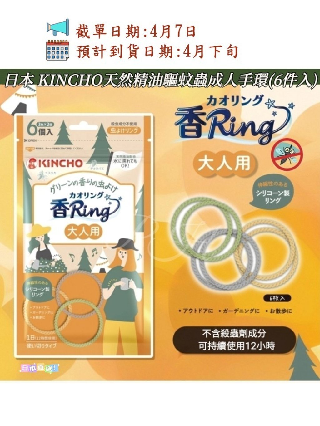 🟡日本 KINCHO天然精油驅蚊蟲成人手環(6件入)🟡