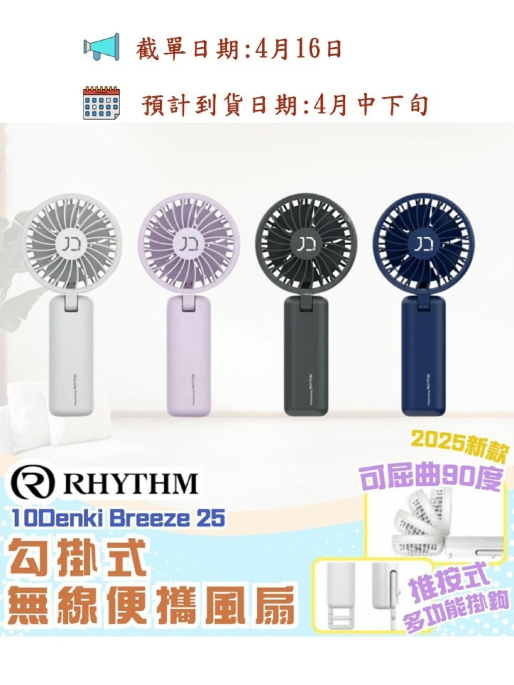 準備大約夏季☀️天氣暑熱一定要買返把🌀今年Rhythm聯同日本品牌10Denki🎌推出Breeze 25 便攜式直立手提風扇✨保留過往最受歡迎的多種顏色之餘,再次突破硬件規格😎👍