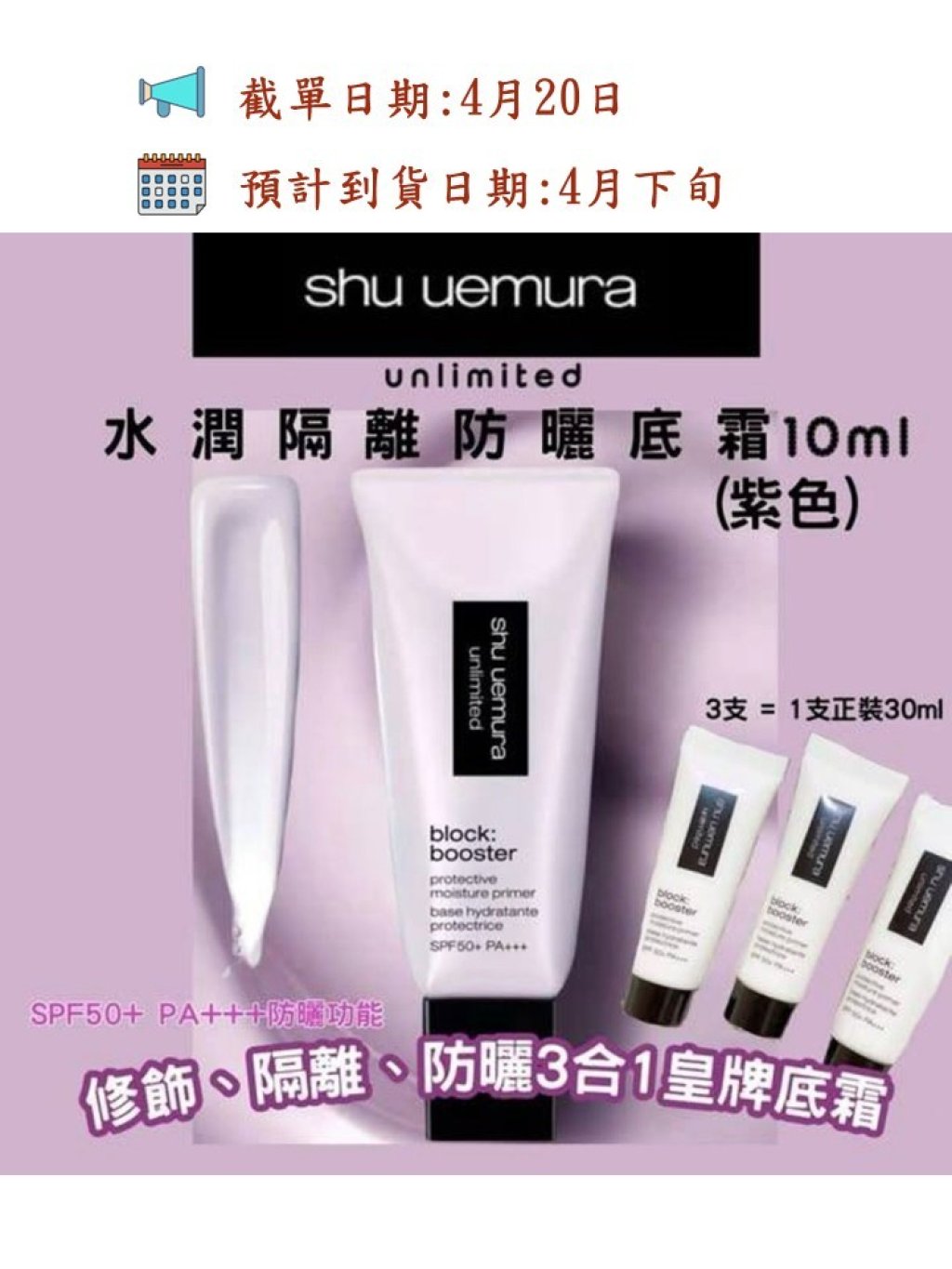 植村秀隔離粧前乳 植村秀紫色隔離 三支支等於正裝30ml,專櫃原價420呢,好用好用,非常推薦,滋潤度剛好一點不油膩,而且紫色是最熱門的,很好的改善暗沉