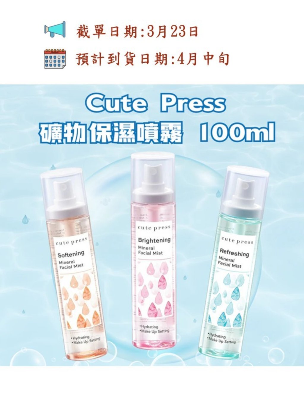 Cute Press 礦物保濕噴霧有 Brightening(粉紅色)、Softening(橙色) 同 Refreshing(藍色) 三款,噴霧幼細,吸收快,幫助肌膚保濕