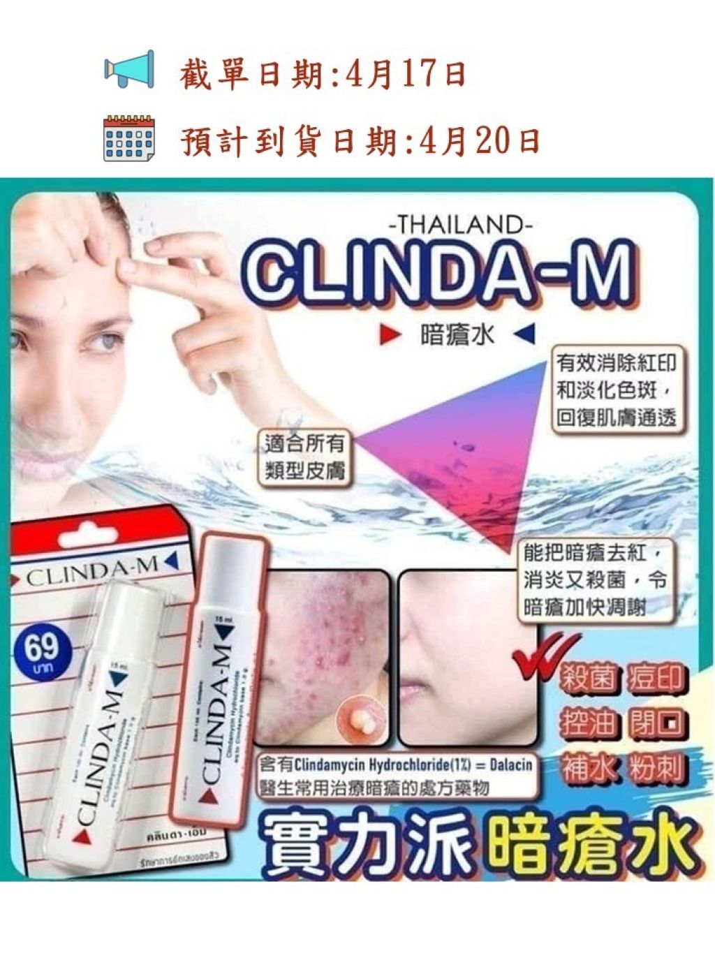 泰國手信必買,Clinda-M 能有效將暗瘡消炎殺菌,令暗瘡凋謝不傷皮膚,有效舒緩敏感、紅腫和發炎肌膚。