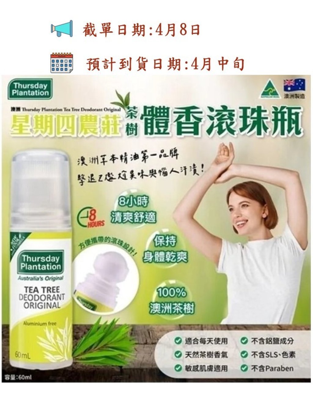 100%純淨澳洲茶樹油,止汗抗菌,有助於消除體力消耗期間的體臭