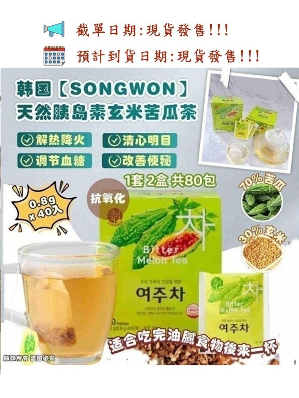 韓國【SONGWON】解熱降火氣😇清心明目天然胰島素玄米苦瓜茶 -0.8g x 40入(1套2盒)(只限批發會員下單)