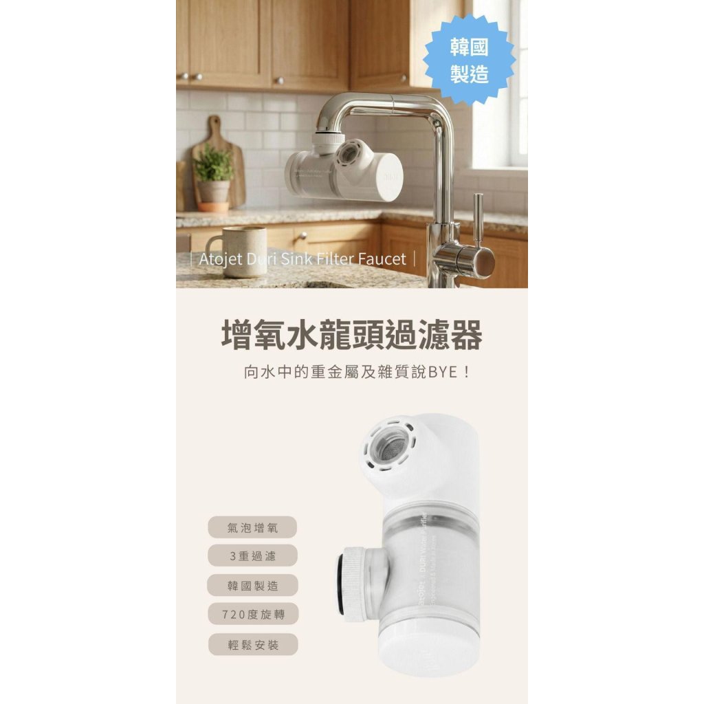 韓國廣受歡迎品牌 Atojet Duri 水龍頭過濾器是一款專為提升家庭用水品質而設計的產品,具有過濾雜質、除氯和抗菌等多重功效,並擁有國際安全認證。Atojet Duri 水龍頭過濾器結合了多種先進技術,旨在提供更潔淨、更安全的用水體驗。🛡️