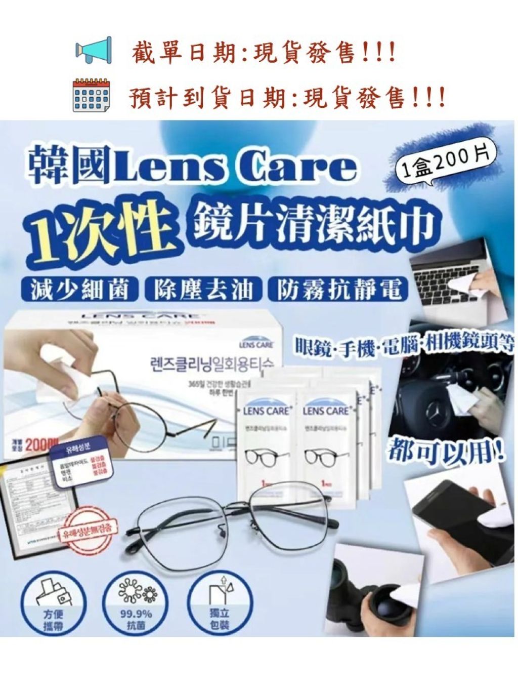 韓國製 Lens Care 1次性鏡片清潔紙巾(200片裝)獨立包裝