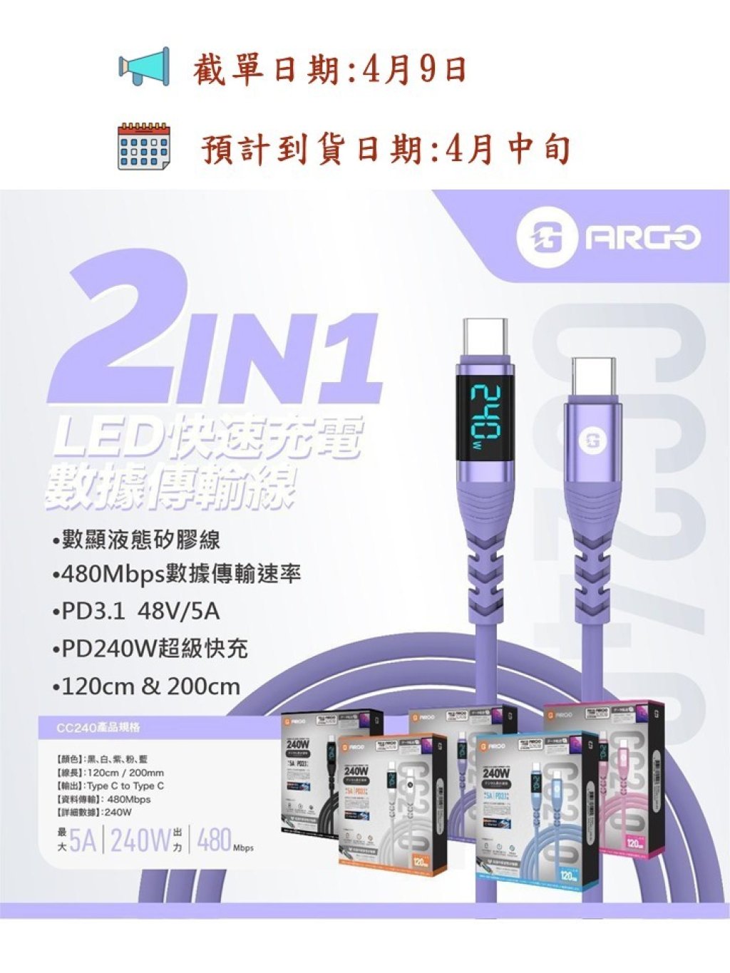ARGO 240W「數顯純充之王」超軟神線 🍬