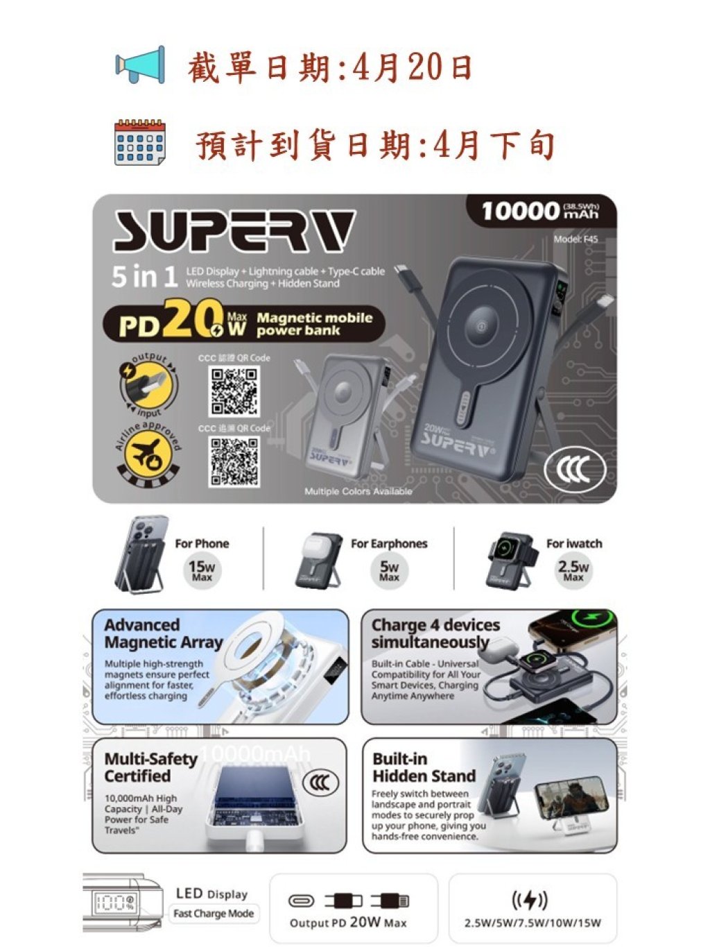 🟡Superv 4合1 LED顯示屏無線移動電源 (MODEL: F45)🟡