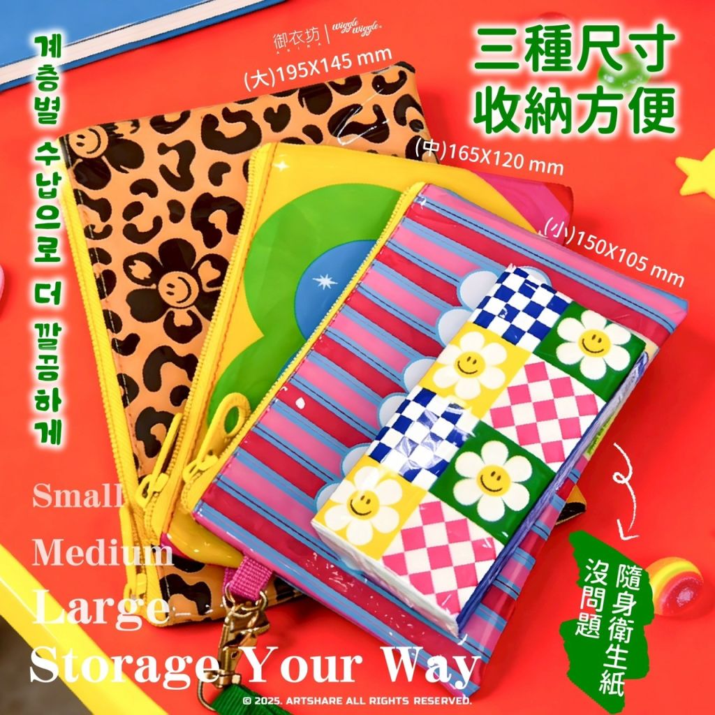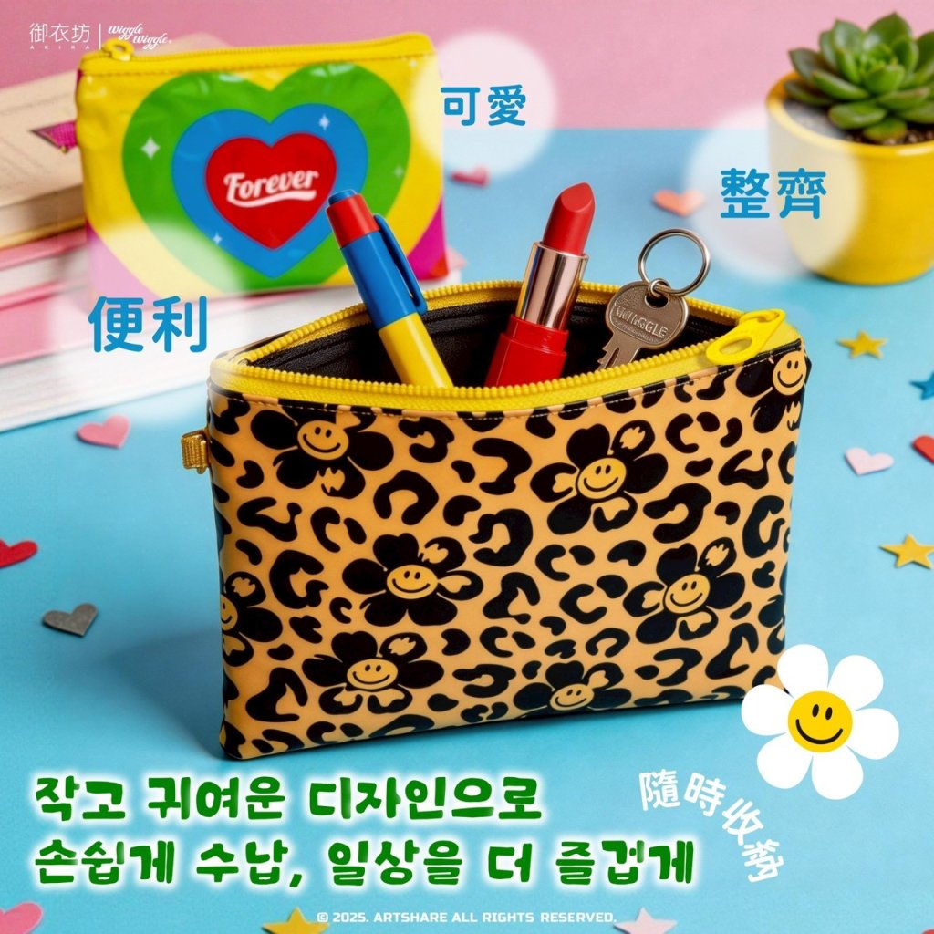 結合經典笑臉小黃花、豹紋與彩虹愛心元素,不僅是收納袋,更是最潮的穿搭時尚單品。